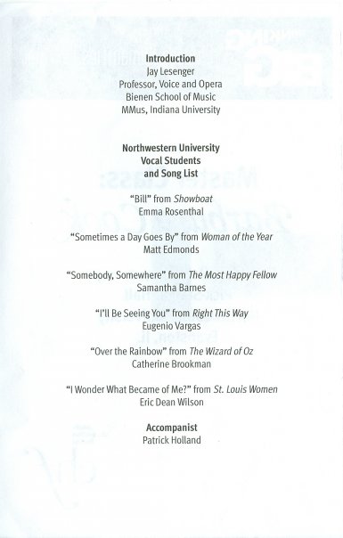 And there were two mentions of the world’s greatest entertainer. It was striking that these mentions did not occur when one of the performers had the chutzpah to perform (and quite well actually, quietly, contemplatively, emotionally, with verse) “Over the Rainbow” as the program notes indicate. Ms. Cook took that performer and her choice of song, as she did each performer with each choice they had made and prepared, on their own terms. She did not talk about who all she had known (and it would be scores of performers) who had done different versions of these tunes. Nor did she sing herself to say “here kid, this is how you do it” though she did sometimes illustrate a point about phrasing or interpretation, to our endless delight, by singing some phrases. No, these were colleagues in her view. She treated them with respect and care. It was touching and emotional on that level alone.