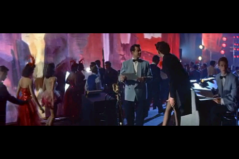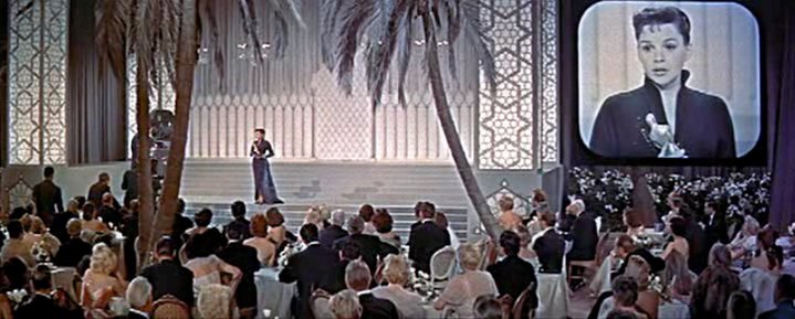 The power of the imagery and framing of shots hit me anew with the screening, a testament to Cukor’s vision. Two particular images haunt me. First, Esther at the Academy Award ceremony on stage after she has been presented with her Oscar, in a long shot. Esther the human being down left, and Esther as projected on a screen for the attendees at the ceremony at the right. Luscious use of widescreen format.