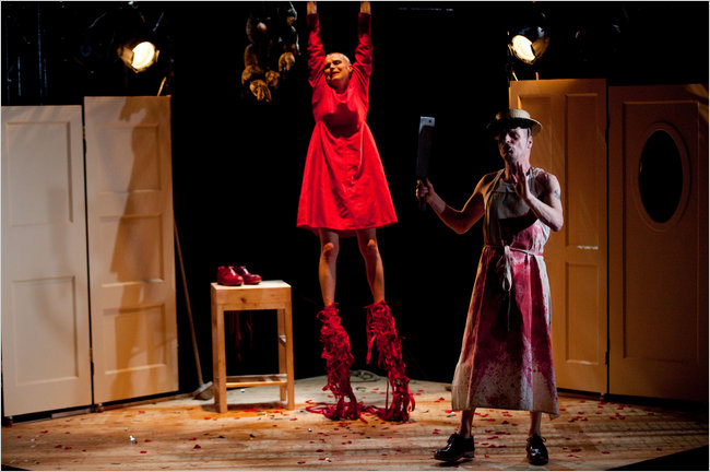 Patrycja Kujawska becomes the young girl, our shoe obsessed character, and is taken in by a blind old lady (Dave Mynne) who attempts to socialize her. Etiquette, church confirmation, the wearing of shoes rather than going barefoot. That kind of thing. The girl selects red rather than black shoes (the old lady’s preference) lies about her choice, appears before the church in white confirmation dress and her red fashion statement, and this causes a ruckus. Here the story telling becomes a bit muddied — but suffice it to say that the girl may or may not have been somehow cosmicly punished for these indiscretions by not being able to stop dancing in these shoes. And forced (as the production image included here suggests) to go to a butcher (Mike Shepherd) to resolve her trauma — the shoes can’t be removed normally (ah, our Oz-ian ruby slippers) so she proposes that he cuts off her feet entirely and construct replacement wooden feet.