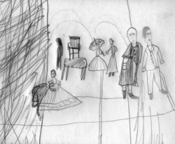 Projected logo, words on black stage, black walls, aged grey painted proscenium, and audience bleacher platforms. Rehearsal white lines on stage floor create two rectangular playing areas in which are piled a desk, two chairs (one atop, one in front), and a black trunk.We suspect the actors will construct what they need out of these components. Thrumming insistent house music creates tension, anticipation. The resulting Freedom Club is a two part intermissionless piece musing on wartime civilities, politics, imagined interactions — immediately after the U.S. Civil War in 1965 and a few years our current future in 2015 .