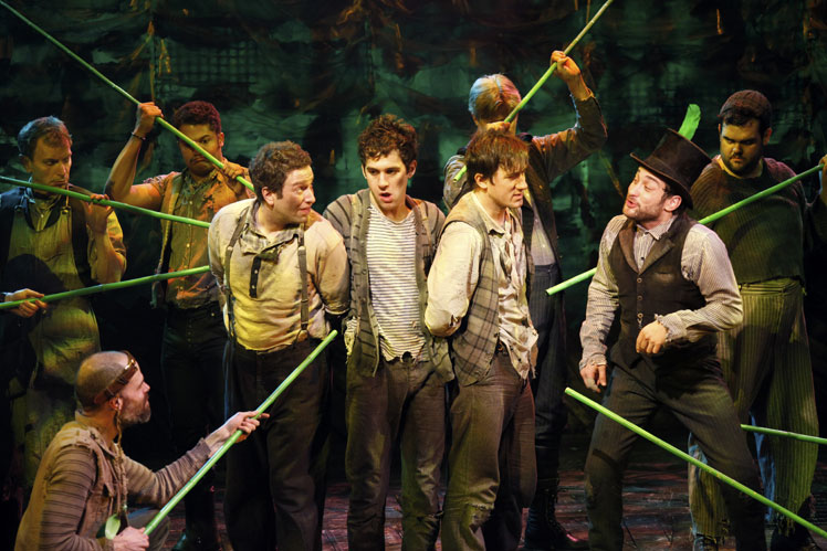 In the days of Queen Victoria‘s reign (“God save her”, as the characters would intone) a band of orphan lads including Peter (Adam Chanler-Berat), Ted (David Rossmer) and Prentiss (Carson Elrod) are sent off to sea by their school master (think the workhouse operators in Oliver Twist). A conflation of ship action dominates the Act One involving one ship helmed by pirates led by Black Stache (Christian Borle, who frequently calls to mind the stunningly fey original musical Hook Cyril Ritchard), and one helmed by a British sea captain held by those pirates and visited by Lord Aster (Karl Kenzler) and his daughter Molly (Celia Keenan-Bolger). Orphan Peter becomes Peter Pan, the boy who won’t grow up and can fly (and this play tells us how he gains that ability, and it’s not by wishing it were so); Black Stache becomes Captain Hook. And we are left to dream.
