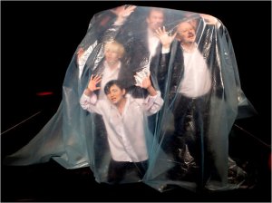 In a word: yes. Combining lithe acrobatic skill and wordless stage pictures, and English supertitles choreographed with the rapid fire delivery of the actors, Being Harold Pinter presents a version of Pinter the man, Pinter the playwright, and demonstrations of events that Pinter may or may not ever have imagined would be suggested by his language. In a world of men and women and androgyny, in a world of black and white clothing and red highlights (the occasional splash of blood on an eye patch or on a menstrual pad reflecting the aftereffects of heinous acts), and light blue of plastic sheeting. Clothed and unclothed, revealing willingly or through torture, the feeling of human beings repressed without reason, without explanation, with endless horror.