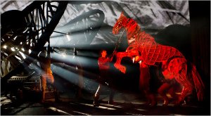 War Horse, currently running at Lincoln Center‘s Vivian Beaumont, holds few surprises for humans familiar with fairy tales and young adult novels. Father and son dynamics play out, a family in need does what it must, two adult brothers compete with lurking filial energy based on who did and did not fight in the Boer War, and a young boy and later a young girl have tender feelings for a horse. Feelings for animals transcend human politics — My Friend Flicka and The Tin Drum and Johnny Got His Gun. For my money, the reasons to attend this production, as the Tony Award Committee has already suggested with a non competitive award for the puppetry to Handspring Puppet Company and a number of nominations for competitive awards, is the stunning stage magic involving everything other than the human beings: puppets (and their handlers), set and costume and drawing design (Rae Smith), projection design (59 Productions), lighting design (Paule Constable), and surging cinematic sound design (Christopher Shutt on sound and Adrian Sutton on music). Some of the images haunt me to this moment, and all these parties had a hand in creating them.