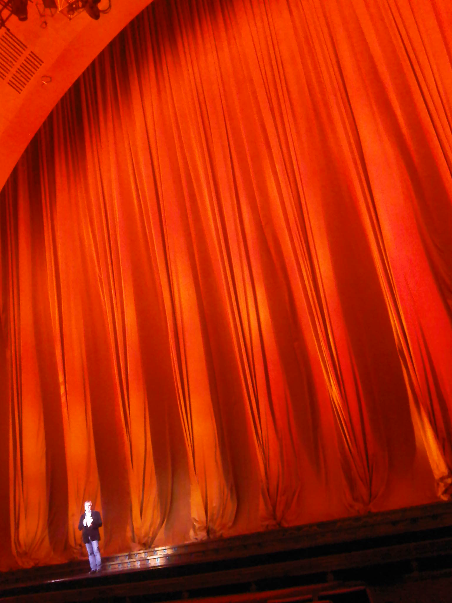I am a romantic when it comes to words, and a harder sell when it comes to visual splash and dance and swaths of theatrical color to tell a story. I admit I pounced on my blogger press invite to a pre-opening morning presentation of the newest Cirque du Soleil extravaganza, crafted for a run at fabled Radio City Music Hall because, frankly, the event was being held AT Radio City Music Hall. A privilege to be welcomed into the venue not for a tour but as a guest with benefits, to have the freedom to snap away at what I saw of the building itself, let alone the creations on stage. The image at right captures my wonderment before the games begin. And those reading this who are veteran attendees of events in this space know this feeling well: give me whatever you got, entertainers, because frankly you have big shoes to fill.