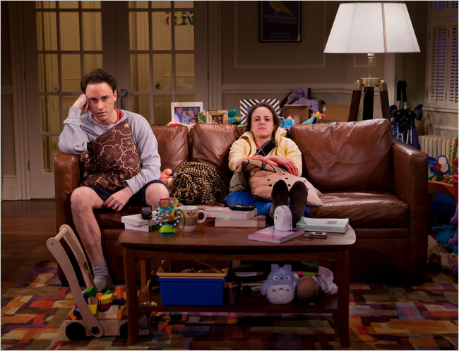 On the one side of the hall the older woman (by five key childbearing years — 34 versus 39, that we soon learn has been rounded down) in a five-year connected couple talks around, then addresses dead on the subject of possible parenthood. Claire (Maria Dizzia) was a B-movie actress who then adolescent Luke (Greg Keller) saw on television in her one big (bad) movie, and indulged masturbatory fantasies (yes we hear about them) by meeting her, then bedding her, then coupling with her in a Brooklyn apartment. We don’t know what she does for a living now; we do know that he (now in his mid 30s) is working for a rich uncle in the antique business. He doesn’t want to move on from their childless state; we and Luke learn in this late night conversation of an old choice she once made (and unbelievable that she never mentioned this fact before) that enhances her desire for a child now. On the other side of the hall in the second act, we are introduced in an identical yet flipped and toy-strewn apartment to Annie (Maria Dizzia again) and Nate (Greg Keller again), parents of a constantly crying 11 month old. These cries attract the childless and traumatize the new parents.