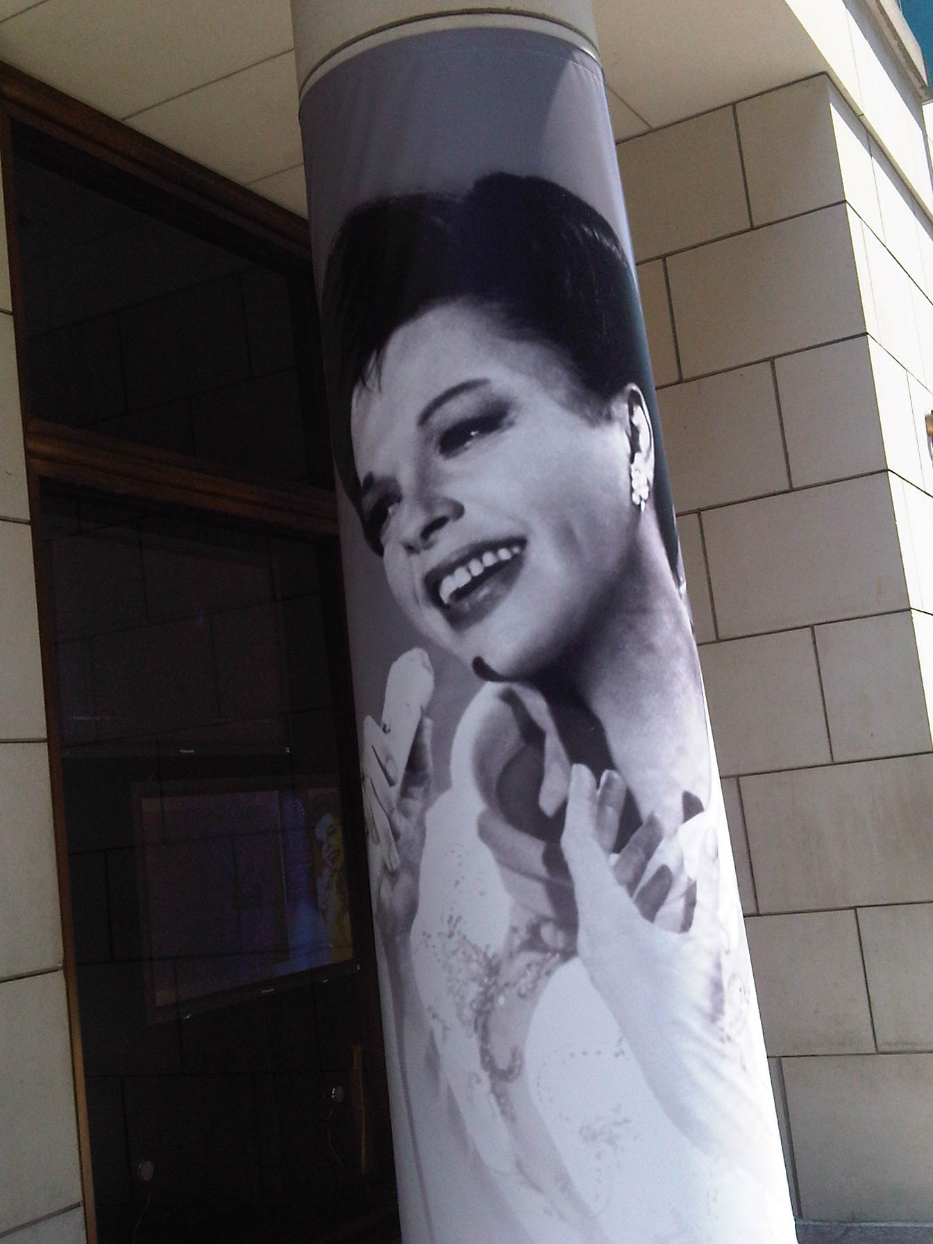 I spend some time at the Paley Center during my first visits as a new member (inspired by this Garland television retrospective), simply drinking in the location.  Outside on the block of 52nd Street between 5th and 6th Avenues cultural streetlight banners honor the event.  The building’s front pillars and video/audio display beam Judy Garlands handsome face and sparkling performance artistry in snippets from a video loop playing in the flat screen displayed in the street level window.