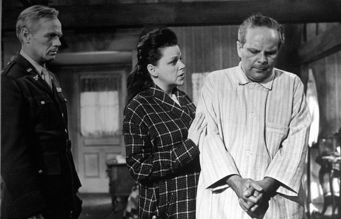 The cast is riddled with excellence, and young actors coming into their own. Spencer Tracy is Judge Haywood the “rock-ribbed Republican” from Maine who has agreed to lead the triad of judges hearing the judges’ cases. Burt Lancaster is Ernst Janning, a brilliant jurist and legal scholar who feels he doesn’t belong among the Party faithful who join him as defendants, yet he joined them in implementing the Nuremberg laws and, in particular, was judge in the case of a young girl Irene Hoffman who was charged and convicted with consorting with a Jewish man. Marlene Dietrich is Madame Bertholt, our German daughter of the military, whose husband was convicted in a prior trial and executed, whose beautiful home Judge Haywood occupies during the trial, who represents a historical military tradition that has to deal with the era of military service under the Nazi. And then there is Irene Hoffman as a middle-aged woman played by Judy Garland just prior to her historical Carnegie Hall performance in April 1961. Pared to her non-singing acting essence, we have Garland in three scenes: when American prosecutor Colonel Lawson comes to solicit her testimony on this painful experience of many years before, and two courtroom scenes. It has been said that when Garland’s emotional second courtroom scene was shown in rushes to the assembled cast, they burst into spontaneous and unanimous applause. One feels that same instinct at many moments in this magnificent and important movie.
