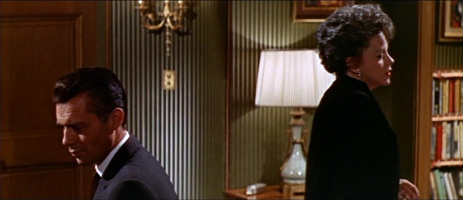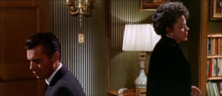 In what was to be Garland’s final completed film, she makes another entrance with the camera at her back. Note that throughout this movie there are scenes in which her silhouette is etched in doorways or framed by windows to highlight some emotional reality for the character. It is a dimly lit and shadowy tale of limelight and spotlights and off stage realities of paths not taken and embracing one’s destiny. Jenny Bowman (Judy Garland), American singer in early middle age is performing in London and contrives a visit to her old flame David Donne (Dirk Bogarde) for a throat examination. Neither has seen the other for years. We soon discover that they have an adolescent child in common, suspect that David has reared the child with his recently deceased wife, and see that headstrong Jenny desires to see the young man. Jenny and David do visit the boy Matt (Gregory Phillips) at his boarding school in Canterbury, a school vacation leads Matt visiting with Jenny in her London Savoy suite and attending performances at the Palladium, and Jenny’s dreams grow of bringing Matt into her life. She doesn’t intend on stealing him away from David so much as taking both of them on — she is trolling for connection with both men. All agree by the end of the movie to keep things at status quo and we leave Jenny on stage receiving rapturous applause.