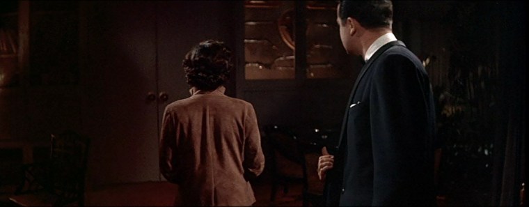 Jenny, post examination, cajoles a drink for old time’s sake out of David. While re-applying her lipstick in the mantel mirror, she spies David place a framed photograph face down on the table by the liquor that we as an audience understand immediately to be the child in question. There are secrets in the shadows, and lurking past hurts. A quick glance, both back and face and subtle reactions.