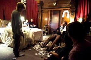 After an intermission we troop back into the reconfigured room, with the bed moved at a right angle, fast food wrappers and full ashtrays adorning surfaces and the now ratty rug, and are free to seat ourselves. Adam Rapp‘s Animals and Plants offers a smaller cast and a bit of magic realism in a remote motel room, evoking at many points images and memories of the surrealistic 1990s television series Twin Peaks. Two misfit young men Dantley (William Apps) and Burris (Matthew Pilieci) are trapped in a trashed motel room, waiting for a drug connection. Or so we are led to believe. A spacey empathetic hippie child Cassandra (the reference is not subtle — played by Katie Broad) sticks around for a while then bolts when things get grisly, while her shaman-like bearish husband Buck (Brian Mendes) lurks about the edges of the playing area. The acting is masterful, the stage effects realistic, and depending upon where you elect to sit you may (as I was) be quite up close and personal with some stage blood and naked bodies.