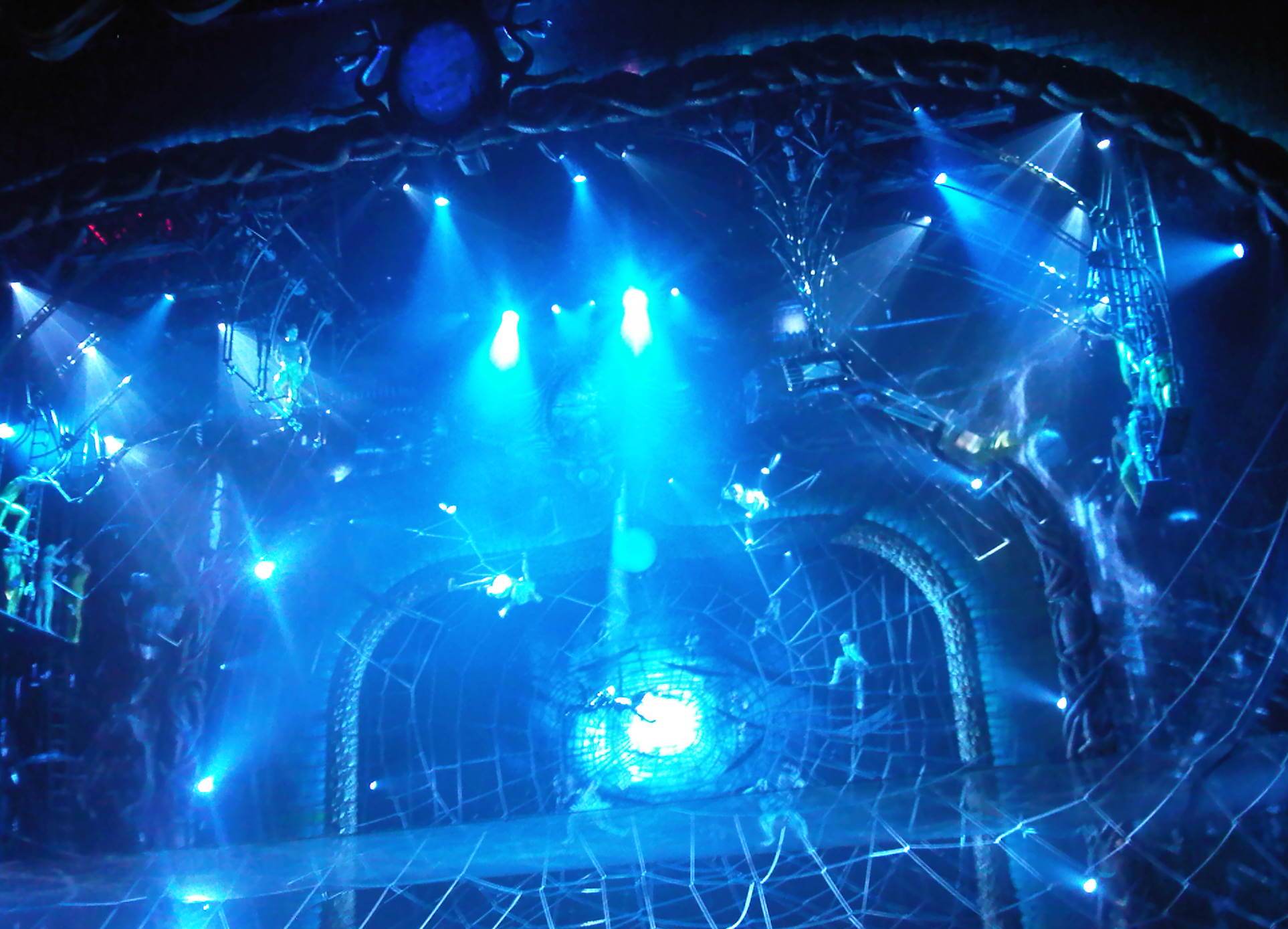 When our Arachne (T.V. Carpio) guiding spirit, transformed from the image out of Greek myth generated during Peter’s initial book report, appears to sing to him in “Rise Above”, I am reminded of my press preview response to Zarkana at Radio City Music Hall (see full post here: http://wp.me/pHkrs-1ff). We were allowed to snap photos on May 24, 2011 and mine appears here. Webbing and all — the currently running Cirque du Soleil show indeed does achieve a more evocative and powerful spidey image than is created in Spiderman, as I suspected months ago. And without words (or words that can be understood), the Cirque version is more enmeshed (sure, take the pun) with the story than the spider queen Arachne images created here.