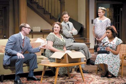 In our first act an all-white neighborhood is about to change with an African-American family’s purchase of a home within its borders. Inspired by Lorraine Hansberry‘s life experience and her play A Raisin in the Sun based upon those events, this 1959 act introduces us to parents Russ (John Judd) and Bev (Kirsten Fitzgerald) who are selling their home to start life anew in another Chicago neighborhood. Their domestic Francine (Karen Aldridge) navigates enduring final days of balancing the subtle racism of her employment situations with her more straight-talking husband Albert (James Vincent Meredith) comes to retrieve her at the end of her work day. Parish priest Jim (Brendan Marshall-Rashid) stops by to assist Karl (Cliff Chamberlain), member of the homeowner’s association who has paid a visit to the new African-American purchasers of the property to offer to buy them out (our specific character link to Raisin‘s plot). Karl’s very pregnant wife Betsy (Stephanie Childers) is present, waiting, oblivious, loving., and deaf. Act Two 50 years later re-sorts the roles of dominant class and culture and each actor takes on a different mantle, a different role, a different degree of power, and joins the conversational dance from a different position — domestic becomes homeowner, mourning father becomes workman, and the ghost of the deceased war veteran visits and communicates across the generations through letters left behind.