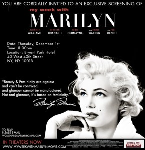 My Week With Marilyn Women and Hollywood Screening December 1, 2011 Bryant Park Hotel, 40 West 40th Street production web site Think of the lot of ’em, and there are […]