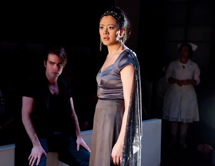 Go for the creative use of blood bags. Go for marvelous sheep and the rest of the flexible and often quite beautiful costumes by Loren Shaw. Julia Noulin-Merat has carved a black box and two-sided audience seating, and Ed Sylvanus Iskandar has choreographed fluid end-to-end action that calls to mind the original Lookingglass staging of Mary Zimmerman‘s Argonautika. Haunting and beautiful and compelling and quite filling, in all senses of the word.