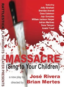 Our rag-tag group of New England townspeople from the small town of Granville is led by Panama (Jojo Gonzalez), a suit-wearing gentle leader. Hector (Brendan Averett) strips to his skivvies and shows us his large out-of-shape body for most of the play — he and his family run a restaurant, and his romantic feelings for Panama are made fun of by several of the group, and are not reciprocated by the ad hoc group’s leader.  Truck driver Erik (Adrian Martinez) and Janis (Jolly Abraham) are married, drifter Eliseo (William Jackson Harper) and Tarot reader Lila (Sona Tatoyan) are having a fling, and Vivy (Dana Eskelson) is a teacher and may have lured their victim to a vulnerable place, promising romantic adventures. The group attacked and killed the final character Joe (Anatol Yusef), a kind of charismatic leader who has been demanding sacrifices and terrorizing the town, if we are to believe the blood and horror the characters exhibit the first minutes of the play. There is celebration and continuing fear, the shared feeling that “something doesn’t feel finished”, and a knocking comes at the door.  Is Joe dead?  Is the Joe the rest of the characters don’t really see but hear on the other side of their shelter’s door for most of the second act really alive?  Are we dealing with a non-human creature, evil incarnate, or some kind of retributive force of nature? (There is much talk of how the earth has been tilled with blood and human beings have violated their pact with the earth, that kind of thing, at the end.)