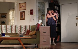 The set by Lauren Helpern (based on playwright Herzog’s grandmother’s Greenwich Village apartment) evokes a life lived deeply but not superficially (leftist philosophy on the shelves, native rugs on the floors, well-worn solid furniture, file cabinets as end tables), and light by Japhy Weideman provides city through apartment windows at midnight, at day break, at evening, at any time. A spare setting for a gentle story of two generations coming together through telling stories of past and present. Trusting each other to tell their stories.