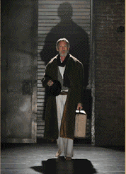 On another bare boned set just a few blocks from the Public Theater stage where Gatz played, with a stage stripped to the backstage walls, bricks and ghost lights and unused materials piled at the edges, one Poet (played in repertory by Denis O’Hare and Stephen Spinella, the latter for the performance I attended) tells our tale. With humor, as an individual, not merely reciting but embodying his story. I am a person here, he tells us, emerging from upstage center wall in shadow and light, who has a story to share with you. A story of our shared humanity.