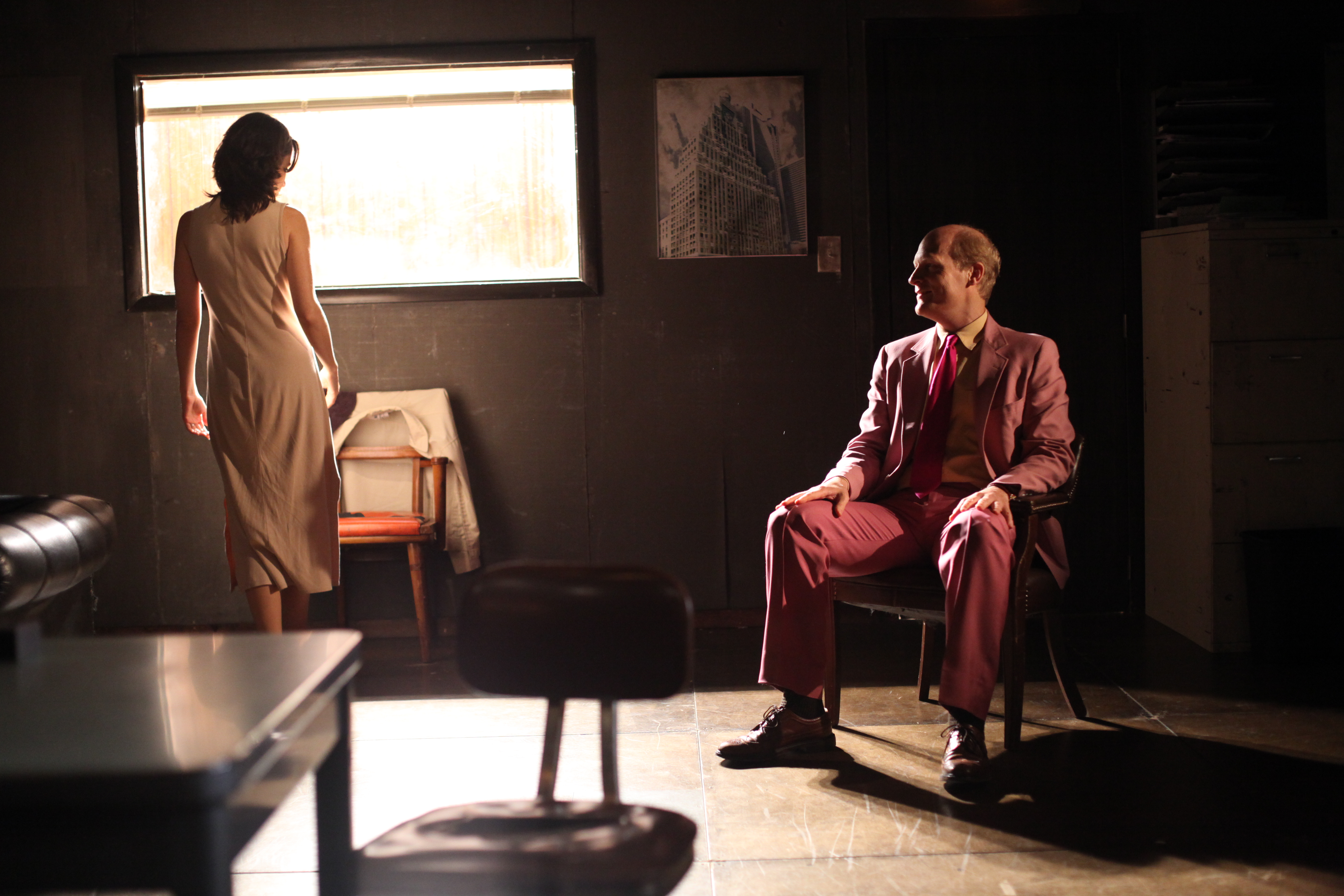 All action for our six plus hours of playing time is in an office filled with aging nondescript Steelcase-sturdy furniture that becomes, with a shift of set piece arrangements or a new lighting scheme or a sound effect of a passing car a hotel room (as pictured here) or a cottage or a highway gas station or a mansion weekend house. Our narrator Nick (Scott Shepherd) and Jim (who we learn to be our Gatz as the action proceeds, Jim Fletcher) and several other characters are office mates then morph into the characters from Fitzgerald’s story of a 1920s renaissance man. Gatz who became Gatsby who made millions by some nefarious means and spends his life yearning for a lovely woman Daisy (Victoria Vazquez) who once got away. Class emerges through couples the self-indulgent rich pleasure seekers find in an area outside of New York City and the summer homes of the rich in “East Egg”, our proxy for one of the Hampton communities.