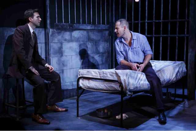 Murder in the First has strong moments often undercut by, as my mother used to say of over-elaborate music, too many notes. Here, a few too many characters, a few too many scenes, a final story chapter dictated to us, and a set design that pulls focus from the strongest elements of this production by placing them stage right when they could radiate from the center. Once the prison location (Willie’s prison cell) is moved to stage right and the center of the small playing area is dominated by the courtroom set, we see the philosophical and intellectual focus on the story, but the emotional impact of the core relationships suffer. The judge keeps order, the prison officials testify, the young attorney finds his footing and gets the officials to admit their priority on control rather than human treatment, and the emotional energy is sucked out of the room. The judge and his gavel don’t always have to be center stage as they are in this production design (says this court researcher in a former life, who has spent years in courtrooms and courthouses all over the country). Courts are inherently dramatic, and court cases are a story often begging to be told well. In this play as presented in its current form we have love story, court case, sibling rivalry, social system, and two terrific male leads in an imbalanced mix. While the court case drama marches on, the electric emotional air leaves the room whenever the Willie-Henry duo are not on stage. Our story is Willie’s story, and to walk away from it several decades into the future to inform us of the year of Alcatraz’s closing is a cinematic choice not a theatrical one.