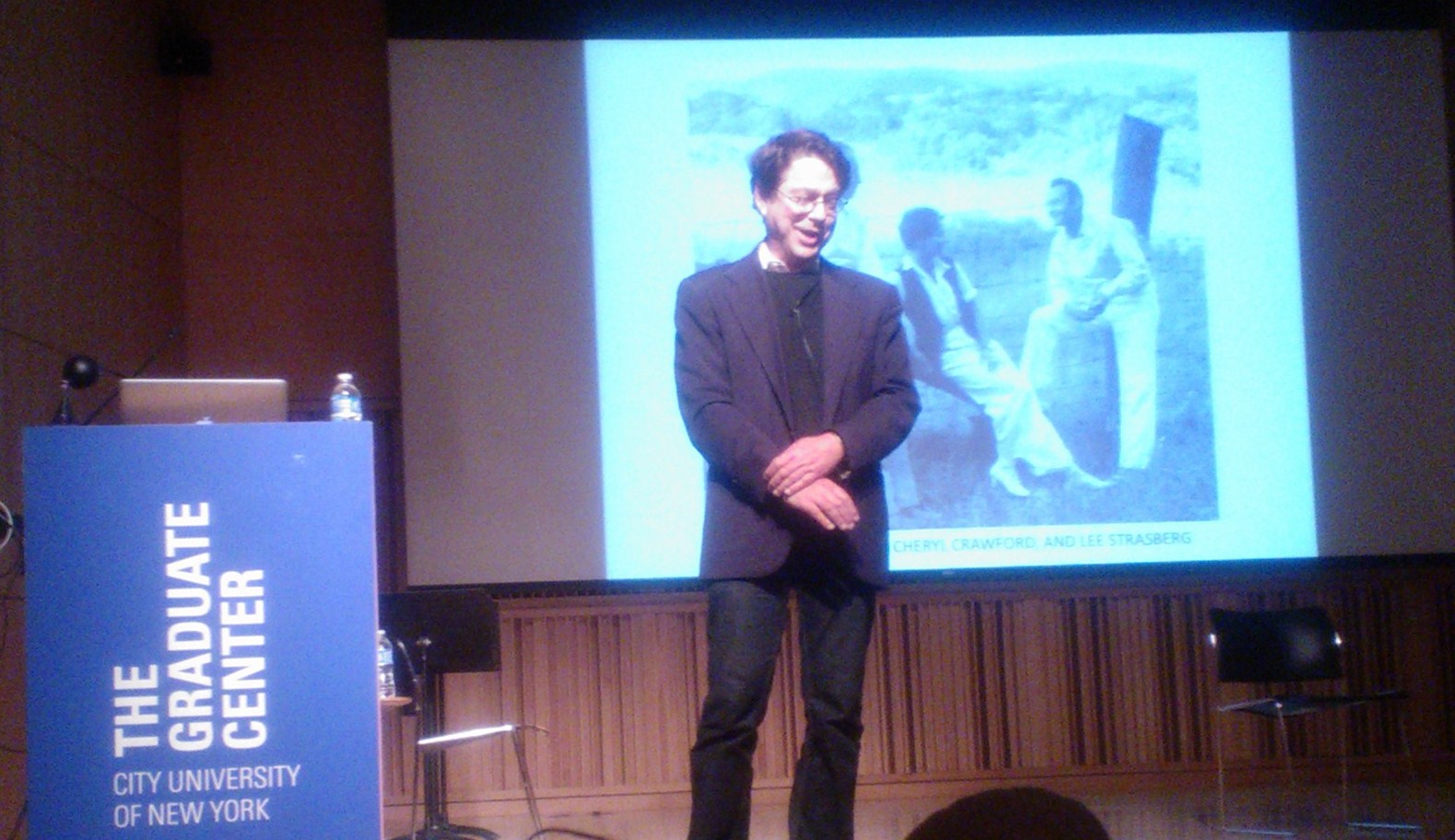 4 June 2012. Mel Gordon standing before Cheryl Crawford and Lee Strasberg — Harold Clurman is obscured (on screen) at left. Image by Martha Wade Steketee.