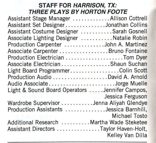 All of the plays take place in Harrison — Foote’s fictionalized version of his Texas hometown. Most of the actors handle the material movingly, and no one more simply and powerfully than Hallie Foote in two roles — as the aunt attempting to inspire some feminine charms in her straight-talking niece in Blind Date, and as the landlady ensuring the house is calm and dinner is on the table in The Midnight Caller. And this consultant, freelance dramaturg was thrilled to see in the fine print credit listings (cropped and included at right) a short credit among those provided in the program Playbill.