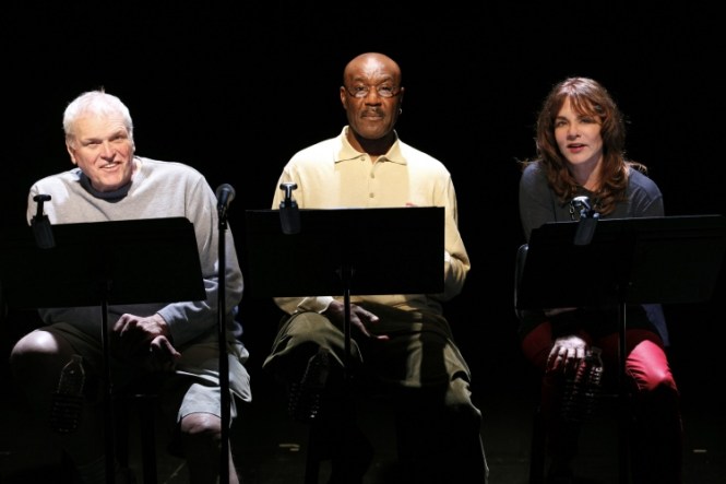 Television and film and well-thumbed beach reads give us stories of citizens who were locked up by mistake, who received a raw deal at the hands of the law, who clamor for justice and in the end achieve resolution or revenge or a bit of both. Those stories on stage or on film or on the page can feel like a journey through legal minutiae and redemption in a “gotcha” moment — with the feeling that well-turned phrase or snappy presentation and the belief in silver-tongued lawyers to achieve the final act win. Those stories turn on the if-only-I-had-Perry-Mason-or-Spencer-Tracy-as-Henry-Drummond-standing-in-for-Clarence Darrow as my lawyer I could beat this thing sensibility. The Exonerated, in a 10th anniversary staged reading at the home of its original presentation (with the same director and with some of the same rotating and non-rotating cast), turns those familiar legal procedural expectations on their heads. We hear the stories of a number of real people who spent years on death row for crimes they didn’t commit, who were released through the procedural defense work of The Innocence Project. We learn little of the legal work behind these characters’ exonerations (that would be an entirely different play) and almost exclusively hear the life stories before and in and after imprisonment of the wrongfully convicted citizens. And the experience of this play, read solemnly, directed acutely, lit strategically, is aching and powerful and true.