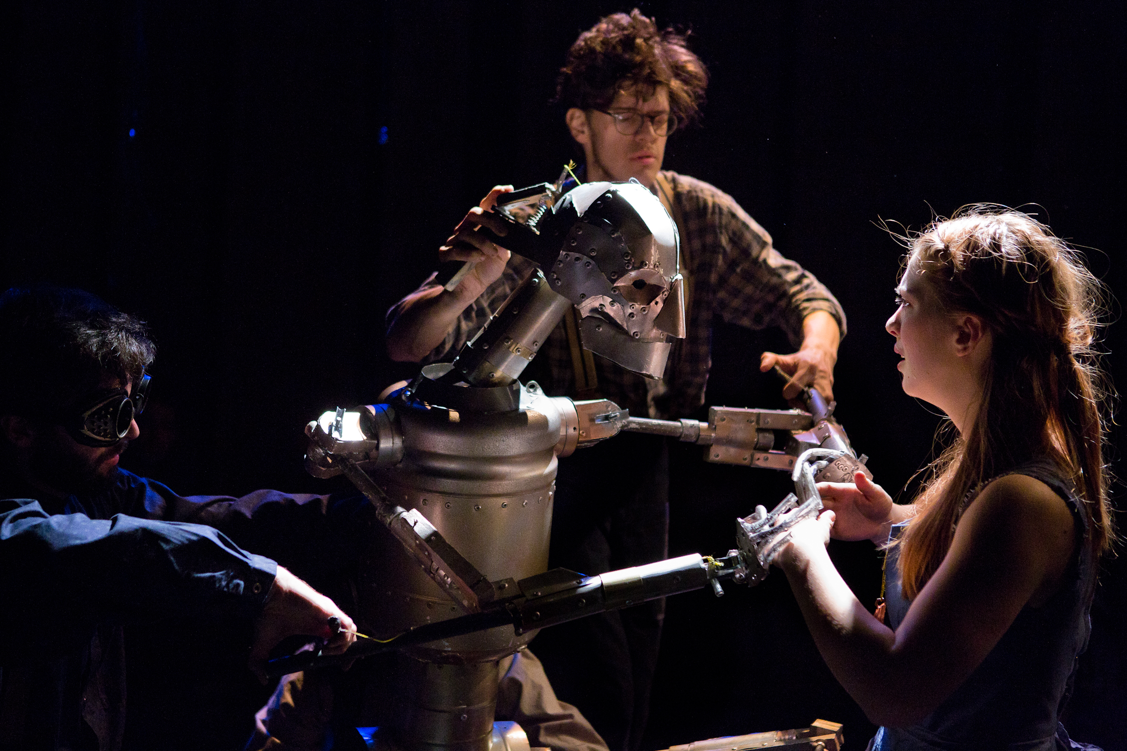 An almost wordless theatrical experience, with an initial framing monologue, movement and music throughout, elegant puppeteering, and lovely lyrics delivered by the enchanting ensemble at the end. Spare, inspiring, moving, delightful theatre with sometimes handheld lighting and other simple shadow effects. Occasional moments inspire thoughts of the 1939 M-G-M evocation of the Oz world — e.g. an oil can that emerges to un-squeak Nick’s newly assembled arms makes the distinctive sound “cluck cluck” sound of the oil ministrations by Scarecrow and Dorothy to the 1939 film’s rusted Tin Man. These derivative moments are fun (my audience happily chuckled) and yet are far between. Strangemen & Co.’s delicate fairy tale-telling wonder draws from some of the same raw materials as prior films and staged creations and still is all new, “great and terrible,” and simply marvelous.