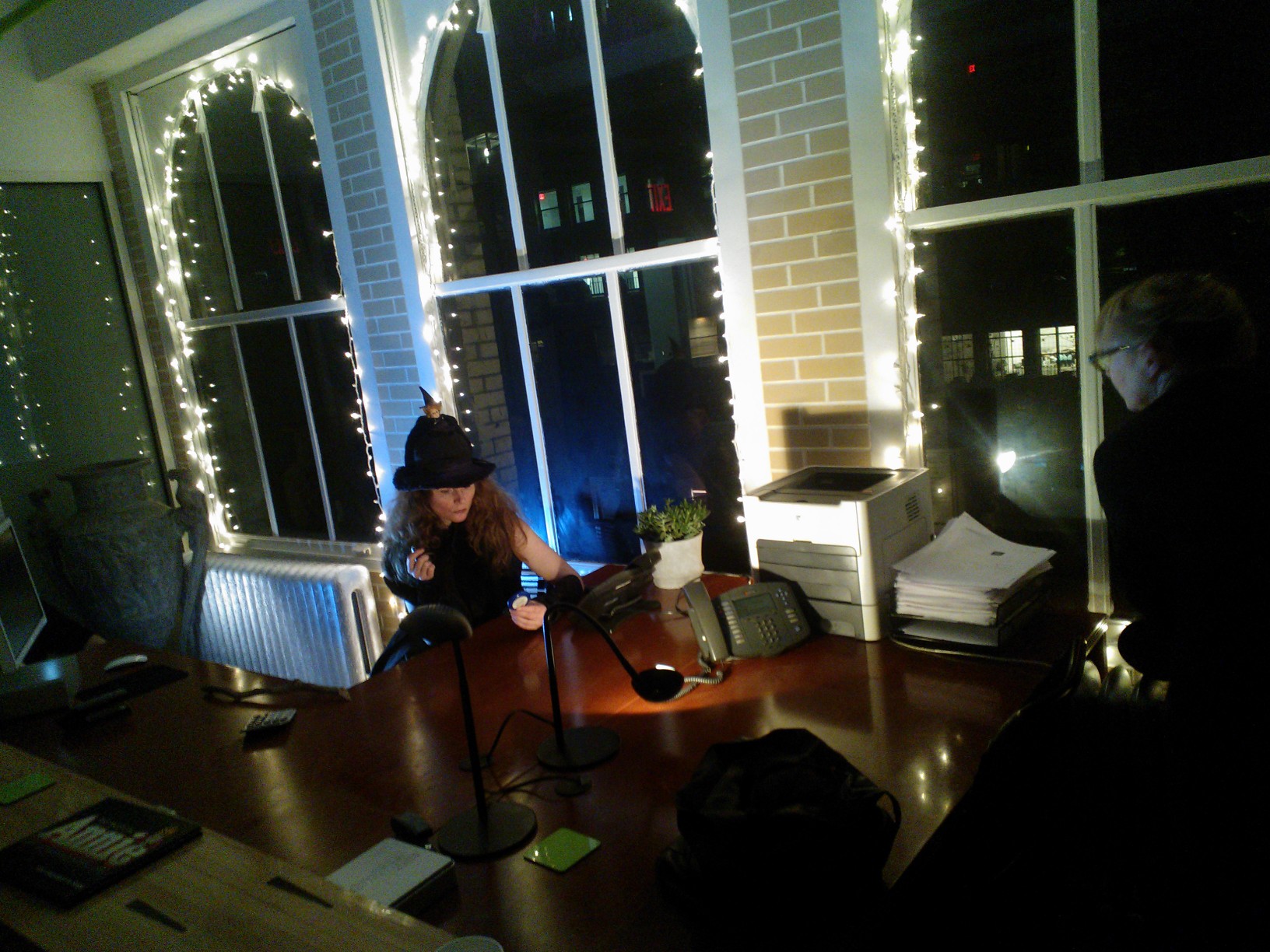 (L-R) Unidentified actor, Fabrice Trombert, Paul Lazar, Tymberly Canale. Image by Martha Wade Steketee.(L-R) Unidentified actor interviews Paul Lazar. A job performance review? I love the low light. Note co-director / chroegrapher Annie-B Parson in shadows at far left. Image by Martha Wade Steketee.Fairy lights in situ, Ich Kurbisgeist performer ponders make up application, as all good receptionists do from time to time. Costumer Suzanne Bocanegra looks on from the right. Note publication about Korins’ design for the 2012 Annie revival on the desk at left. Image by Martha Wade Steketee.(L-R) Tymberly Canale, Paul Lazar. The possibilities are endless. Image by Martha Wade Steketee.(L-R) Fabrice Trombert, Paul Lazar, Suzanne Bocanegra. Image by Martha Wade Steketee.(L-R) Annie-B Parson, Fabrice Trombert, Paul Lazar. Image by Martha Wade Steketee.