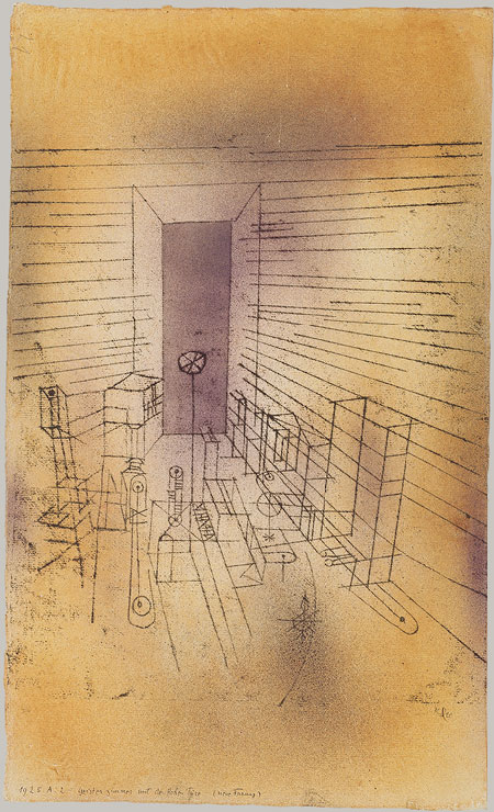 The Neue had additional gifts for me this visit. New arts works to bemuse and entrance, and one that led me down another thematic visual leaps and associations. Paul Klee has been a favorite for many years in many forms, and the Neue has a healthy collection of his art works. One stopped me in my tracks is crafted of water color and printing ink and gouache, eerie and suggestive, a nightmare image of a room, a chamber, with hints at perspective lines and suggestions of solidity. Paul Klee, Ghost Chamber with the Tall Door (New Version), 1925.