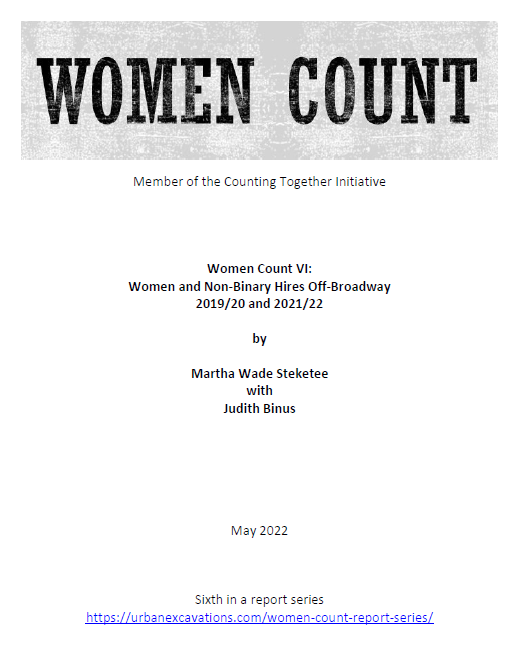 The Women Count project collects and publishes analyses of New York City Off Broadway production credits to assess gender parity in theater hiring decisions. Since 2014 the report series has addressed several basic questions. Whose plays are being done? Who is directing them? Who is being hired for theatrical off-stage roles in New York’s theaters beyond Broadway? The goal of the report series is to change the conversation from anecdotes to action plans to support advocacy efforts on behalf of women and nonbinary playwrights, performers, and off-stage theater workers.