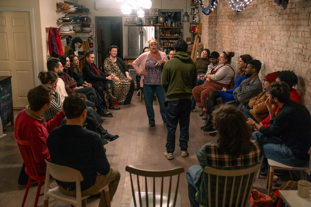 Float the idea of “immersive” theater to a group of theatergoers, and some significant portion of that group will groan. Add the thought that the audience one joins if about twenty strong, that groan might grow louder. In the hands of expert actors performer a script (or at least a structure) that holds multitudes of thoughts and themes and characters, and audience instructions (no you don’t need to participate and in fact are encouraged at most points not to) and group management, a show that presents as a support group circle complete with snacks holds us as it holds the actors.